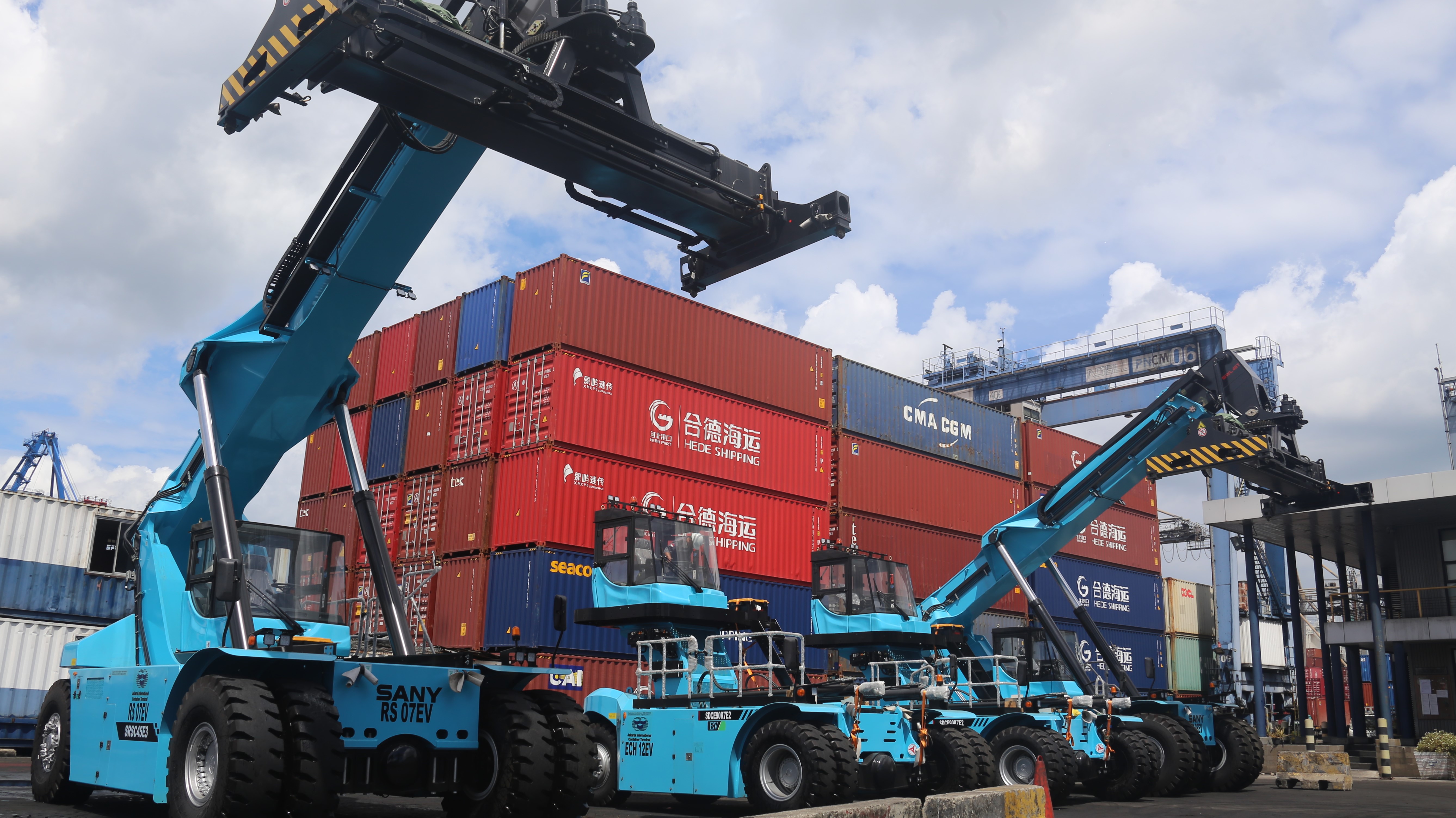 Sebagai bagian dari kesiapan operasional, JICT mendatangkan 4 unit alat baru berupa 2 Unit Reach Stacker dan 2 unit Side Loader berjenis Electric Vehicle (EV).